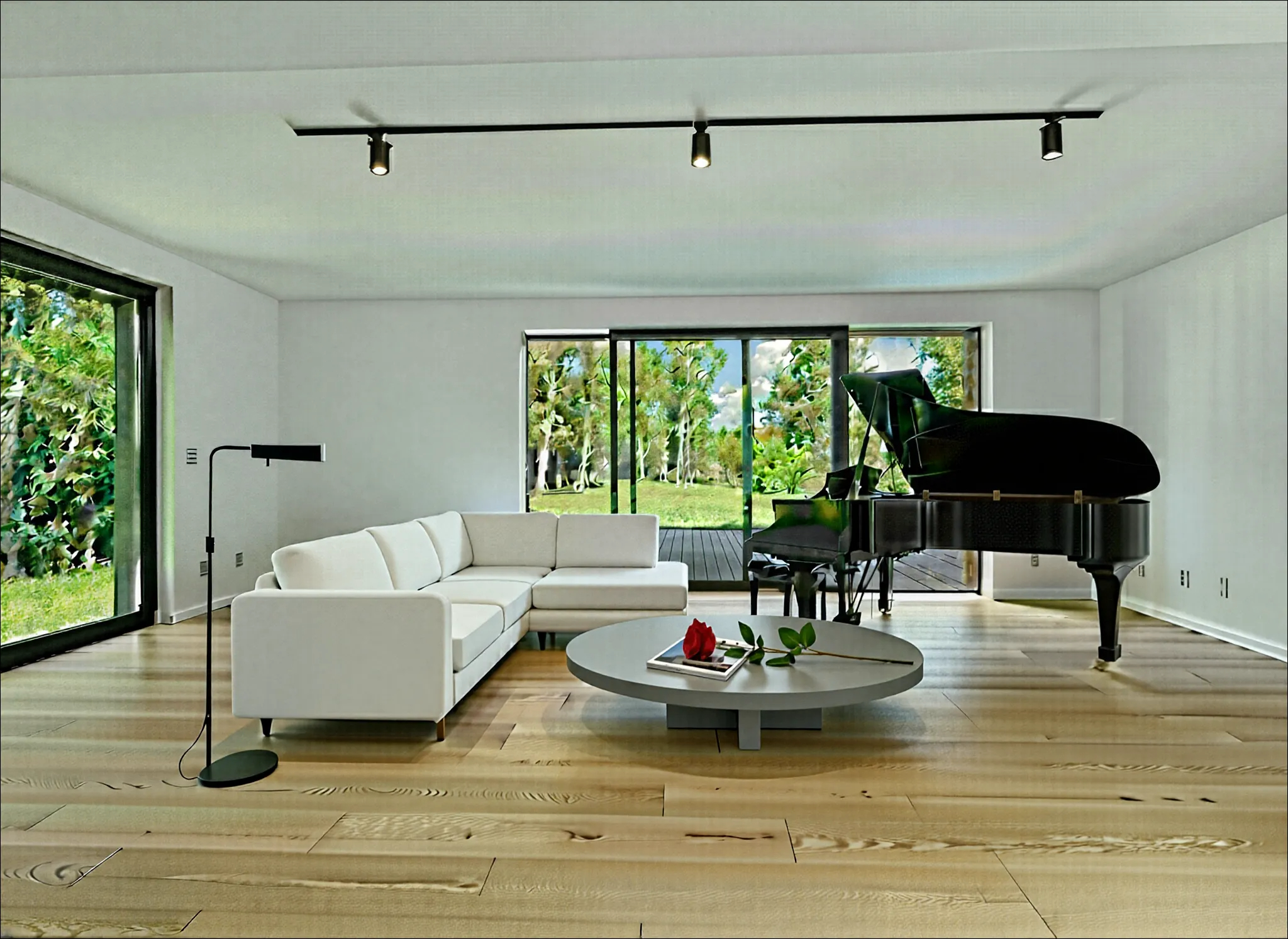 • Materialschema: Betonoptik, weiße Wände, weißer Stahl, Sockelleisten weiß, Holzfenster antrazith, Glas, graphitschwarz (Türgriffe, Lampen, Kamin)