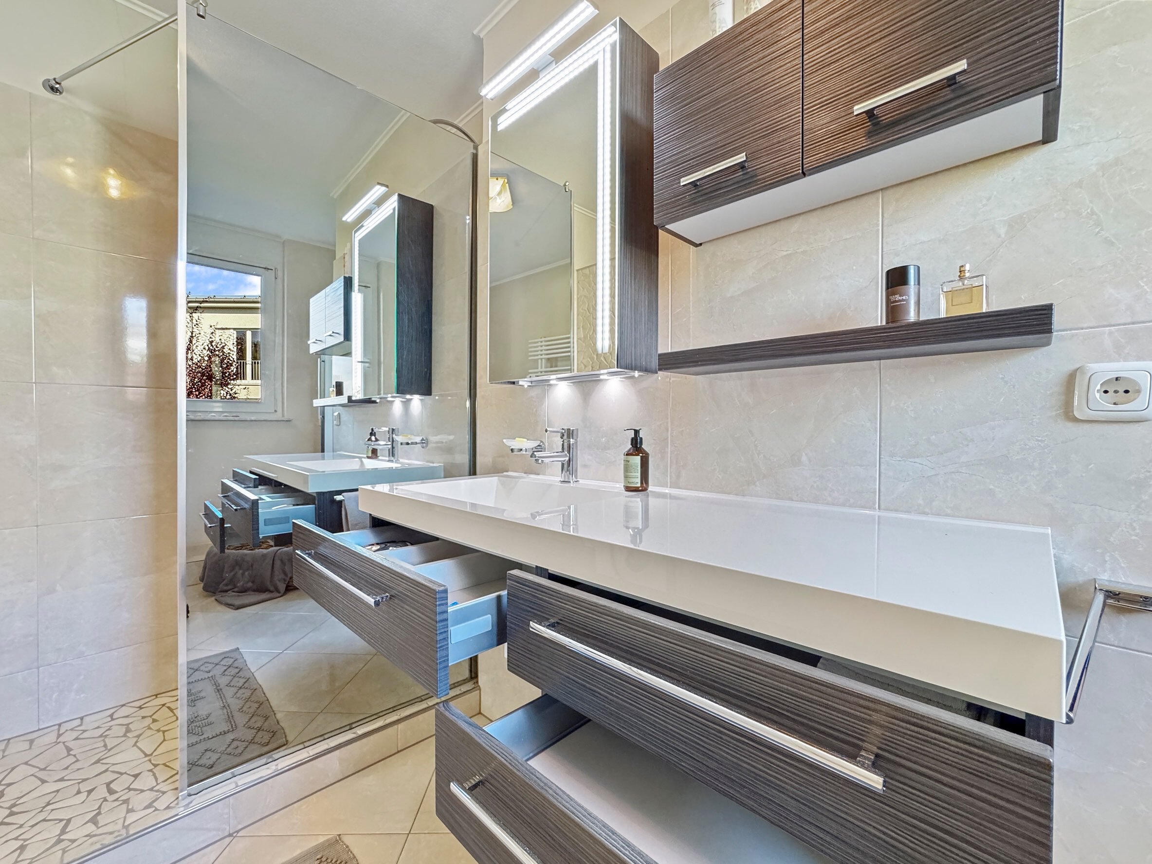 • modernes Waschbecken in eckiger Form mit Ablagen, Schubladen, Stauraum und LED-beleuchtetem Spiegel