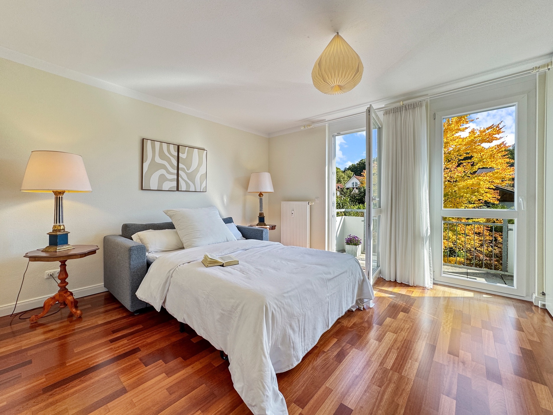 Die ruhige Wohnung liegt in der ersten Etage zurückversetzt von der Anliegerstraße mit herrlichem Blick in große Gärten und ideal nach Osten, Süden und Westen ausgerichtet, bietet den ganzen Tag ein sonniges Wohnerlebnis. Die unmittelbare Umgebung ist geprägt von gepflegten Einfamilienhäusern und kleineren Wohnanlagen, stillen Gärten und begrünten Wegen – ideal für die kleine Familie, Paare oder alle, die Wert auf ruhiges, naturnahes Wohnen legen.