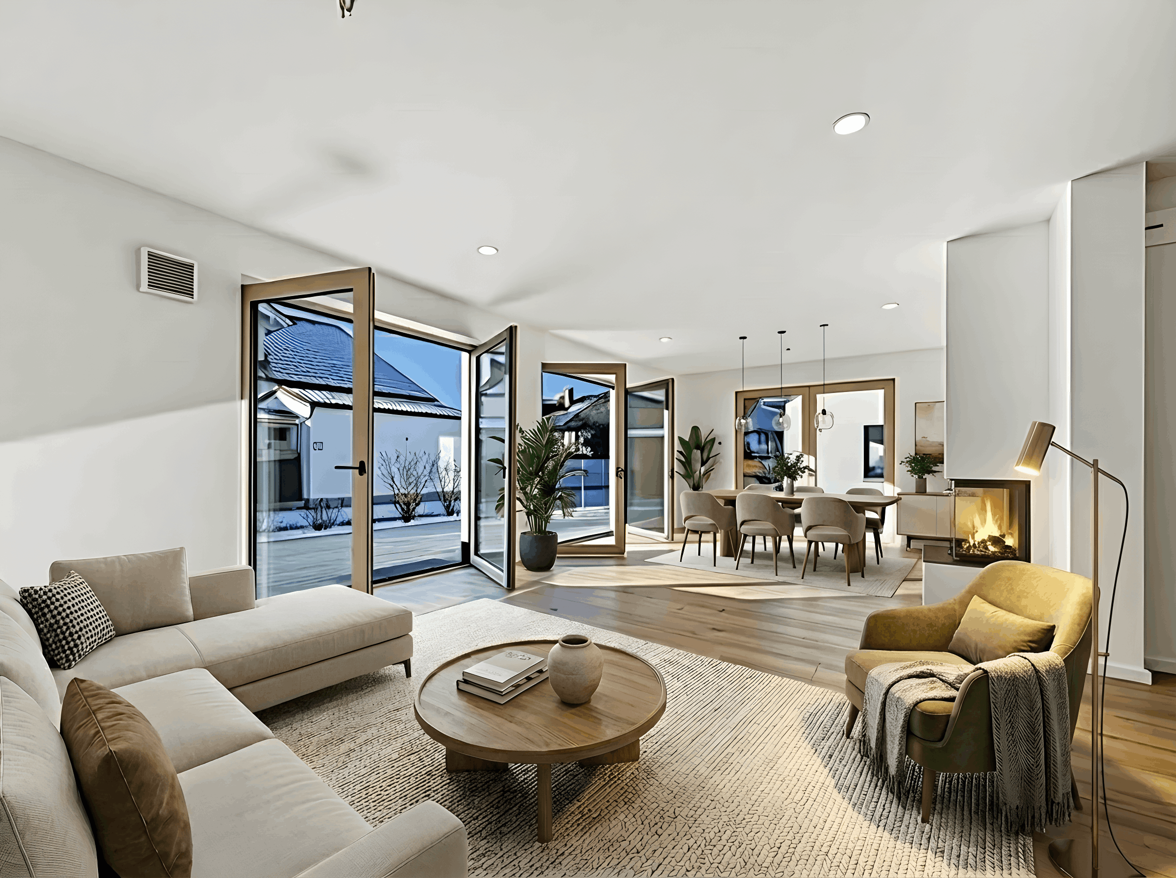 • Große, dreifachverglaste Wärmeschutzfenster, innen Echtholz weiß, außen pulverbeschichtetes Aluminium, anthrazit