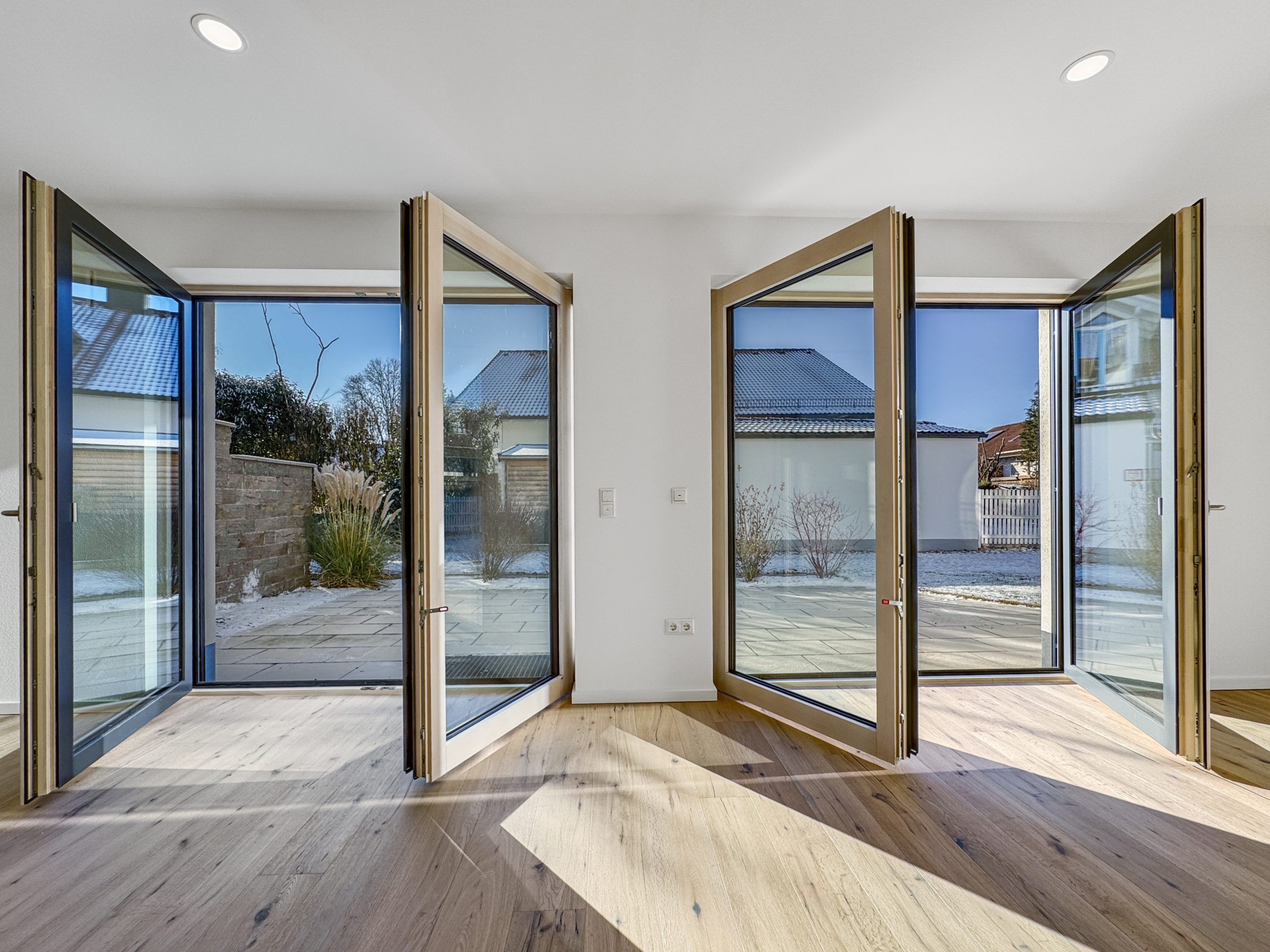 • Große, dreifachverglaste Wärmeschutzfenster, innen Echtholz weiß, außen pulverbeschichtetes Aluminium, anthrazit
